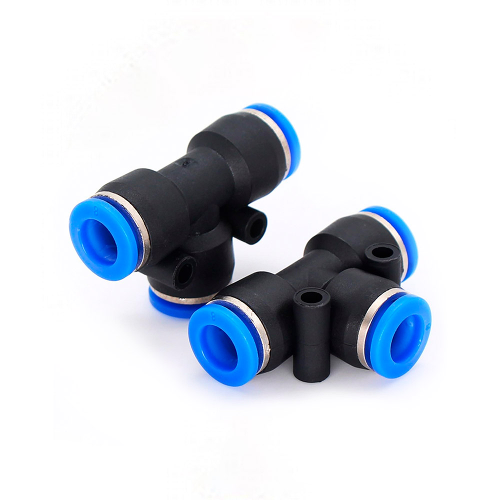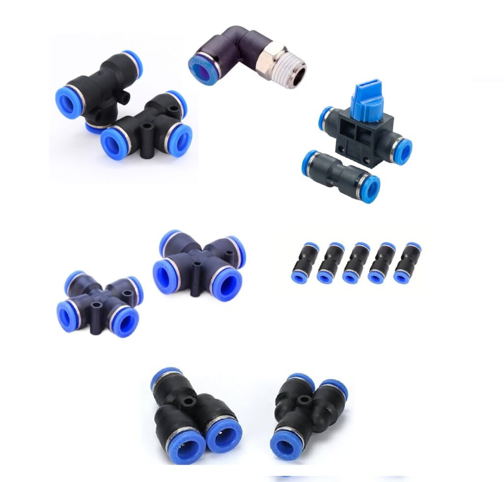 Conexiones neumáticas en plástico. Adaptador T x MF, Adaptador T x T, bifurcación, C/90 T x T, C/90 T x MF, llave de corte, Tee T x T x T, Tee T x T x MF